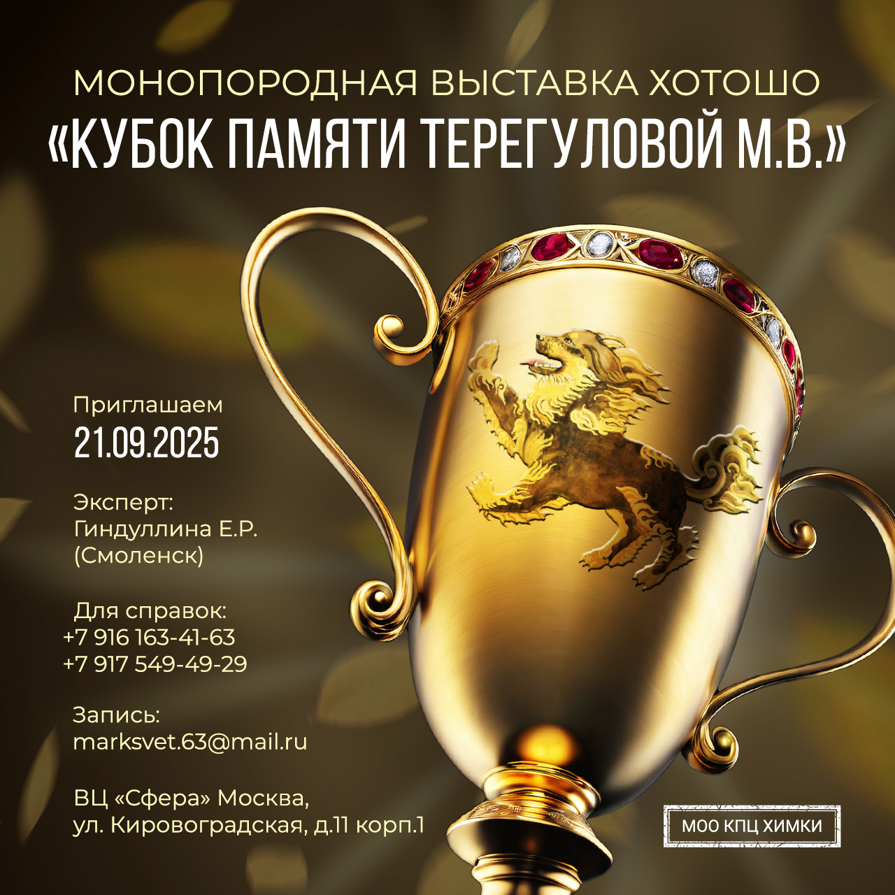 ЕЖЕГОДНАЯ МОНОПОРОДНАЯ ВЫСТАВКА ХОТОШО «КУБОК ПАМЯТИ ТЕРЕГУЛОВОЙ М.В.» МОО "КПЦ" ХИМКИ Дата проведения 21 сентября 2025 года. . Эксперт Гиндуллина Е.Р. (Смоленск) Для справок: тел: +7 916-163-41-63 тел: +7 917-549-49-29 Запись: e-mail: marksvet.63@mail.ru Адрес проведения выставки: Москва, ул. Кировоградская, д.11 корп. 1, ВЦ«Сфера» м. Пражская. Дополнительная информация по целевым взносам на организацию и проведение зоотехнического мероприятия (САС ,САС групп или моно) будет позже. Ждём на данном мероприятие всех неравнодушных к памяти Марики Викторовны и породе Хотошо. Кто только интересуется породой приезжайте к нам, с удовольствием пообщаемся в живую! Передлагам всем желающим принять участие в подготовке данного мероприятия.