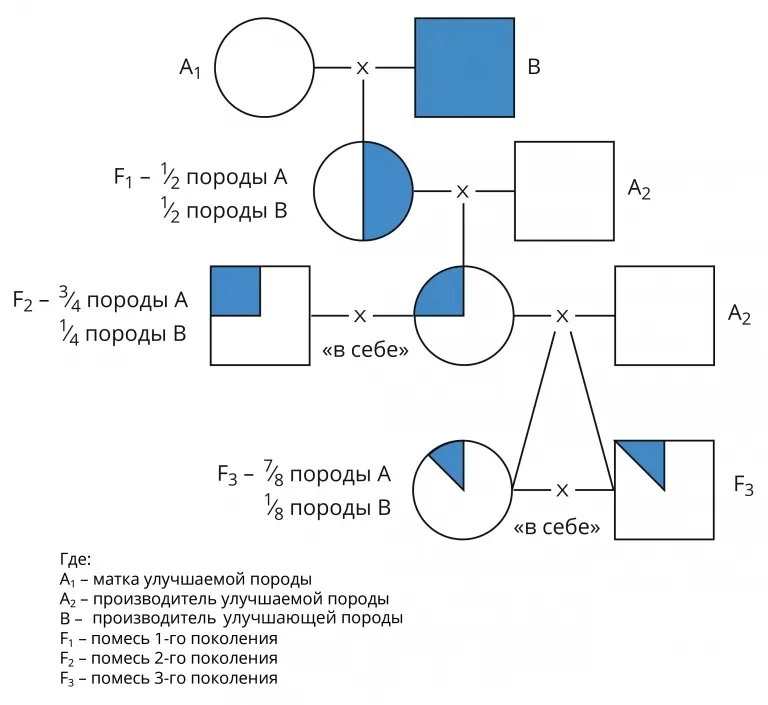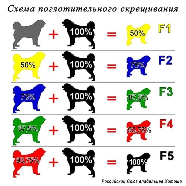 ЕСЛИ ВАМ ИНТЕРЕСНЫ проценты в породе Хотошо можете к нам присоединиться. Обращайтесь по тел: Полякова Валентина Михайловна Фенотип формируется на основе генотипа. Что такое фенотип? Фенотип включает в себя все наблюдаемые характеристики животного, которые доступны для нашего восприятия. Важно помнить, что фенотип не является абсолютным показателем и гарантом принадлежности к определенной породе. Что такое генотип? Генотип представляет собой совокупность наследственных факторов и сложную структуру генетической информации, которая передается от родителей через половые клетки. На рисунке 1 можно увидеть, как, казалось бы, в из двух одинаковых пакетов сока (фенотип) имеется два различных вида сока (генотип). Животные могут обладать внешними признаками, которые очень похожи друг на друга, но их генетическая структура может значительно отличаться. На изображении 2 представлено, как внешние характеристики/ фенотип и генотип совпадают у группы чистокровных животных. Автор Колесникова Т. -чистокровное-это животные не смешанных пород имеющие закрытое разведение в "себе". При таком чистом разведении легче сохранить тип и достоинства породы, поскольку уже имеющиеся наследственные достоинства приобретают ещё большую наследственную стойкость. Многие признаки начинают наследоваться автоматически .Подбор и одбор производителей по индивидуальным показателям среди чистокровных животных более эффективны. У чистокровных сегодняшних животных всех их предков можно проследить до их родоначальников. (К чистокровным породам могут допускать прилитие чужой крови только если имеется на то обоснованная необходимость с последующим поглотительным скрещиванием.) -Чистопородное -животное ,которое отвечает характеристикам и типом своей породы будет считаться чистопородными но такое животное чистокровным считаться не может. Пояснение к схеме поглотительного скрещивания; Помеси первого поколения от скрещивания двух пород считаются «полукровными», т. е. доля наследственных признаков (доля «крови») каждой из родительских пород у таких помесей представлена равными частями. От спаривания помеси первого поколения с чистопородным животным одной из родительских пород получают помесь второго поколения, степень породности которой условно обозначается: 3/4 крови одной породы и 1/4 крови второй. От спаривания помеси первого поколения с чистопородным животным третьей породы потомство будет сложной помесью, породность которой выражается долями крови: 1/2 третьей породы и 1/4 каждой из остальных двух пород. Если в течение нескольких поколений помесей спаривают с чистопородными животными одной из родительских пород, их породность повышается с каждым поколением и постепенно они приближаются к чистопородным. Помесей 4—5-го поколений при хорошо выраженном типе улучшающей породы считают чистопородными. При поглотительном скрещивании чистопородными считают помесей 4—5-го поколений, а при выведении новых пород методом воспроизводительного скрещивания чистопородными условно можно считать помесей 5-го поколений, разводимых “в себе”. Автор Колесникова Т ПРИЛИТИЕ КРОВИ . Вводное скреещивание/прилитие свежих кровей Вводное скрещивание применяют для исправления отдельных недостатков высокопродуктивной заводской породы, которого нельзя быстро дос